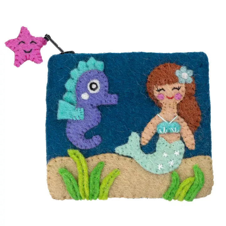This adorable mermaid goes swimmingly with our handy coinpurse! Handfelted with 100% natural wool by a Fair Trade production group in Nepal. Made with a high quality YKK lead free zipper. Convenient size and lined with black cotton. Features a charming felt zipper pull and delightful handcrafted details. An original Wild Woolies design by dZi Handmade, member Fair Trade Federation. 5"w x 4"h
